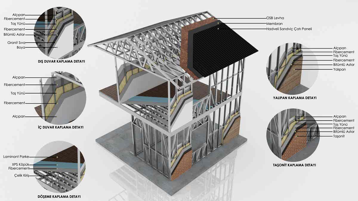• Çatı Kaplama; 122x244 cm ahşağ esaslı OSB levha vidalanarak uygulanır.