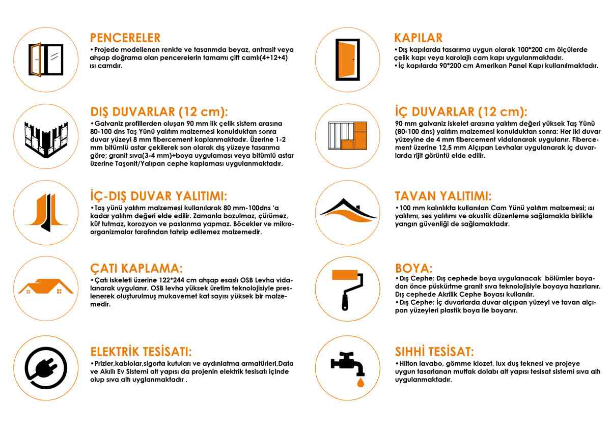 • Dış Duvarlar 12 Cm , İç Duvarlar 12 cm Galvaniz profillerden oluşan 90 mm çelikten üretilir.